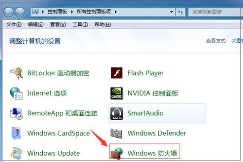 在控制面板窗口中,点击打开Windows防火墙。